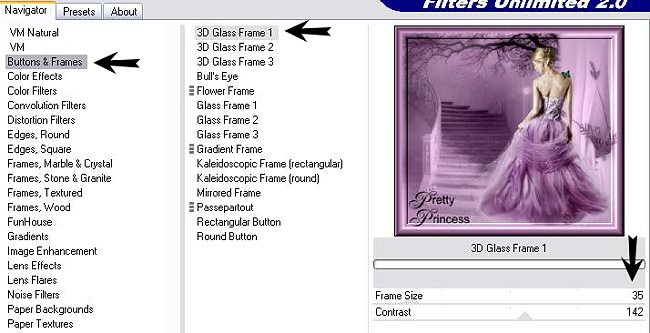 13 - Image/Ajouter des bordures : 20 pixels couleur #683862Sélectionner la bordure avec la baguette magique 14 - Effets/ Unlimited2.0/Buttons & Frames/3D Glass Frame 1 :