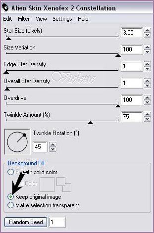 21 - Fermer les calques 1 et 2 Placer vous sur le calque 3 Effets/Xenofex 2/Constellation : clic sur Random Seed
