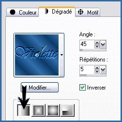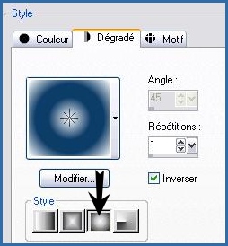 *** 1 - Ouvrir les tubes , les dupliquer et fermer les originaux 2 - Placer en avant-plan la couleur #0d3c68 et en arrière-plan la couleur #336eac Configurer un dégradé linéaire angle: 45°/Répétitions: 5/Inverser coché