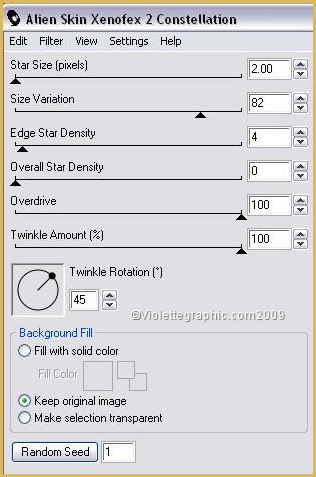 13 - Activer le calque du paysage 14 - Effets/Alien Skin Xenofex 2/Constellation avec ces réglages: