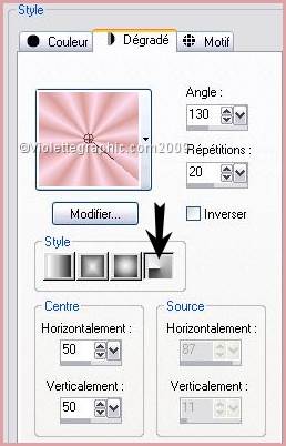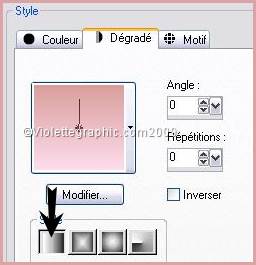 2 - Placer en avant-plan la couleur #fcdbeb et en arrière-plan la couleur #d99e9aConfigurer un dégradé linéaire angle: 0°/Répétition: 0
