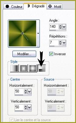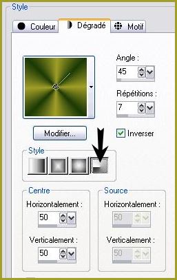 2 - Placer en avant-plan la couleur #a19e29 et en arrière-plan la couleur #1b3907 Configurer un dégradé radial /angle : 45°/ Répétitions: 7/Inverser coché