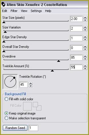 30 - Retourner dans votre PSP Annuler l'animation Effets/Alien Skin Xenofex 2/Constellation avec ces réglages : clic sur Random Seed Calques/Fusionner les calques visiblesEdition/Copier