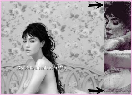 8 - Ouvrir de nouveau le fichier "Bellucci18.jpg" Edition/Copier/Edition/Coller comme nouveau calque Image/Miroir Image/Redimensionner à 80%/décocher " tous les calques" Placer ainsi: