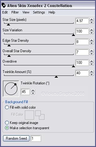 26 - Fermer les calques 1 et 3 Placez vous sur le calque 2 : 28 - Effets/Alien Skin Xenofex 2/Constellation clic sur Random Seed Calques/Fusionner les calques visibles Edition/Copier Edition/Coller après l'image active