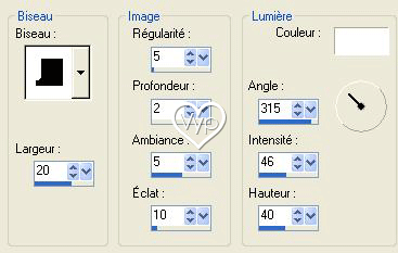 17 – Effets/Effets de bords :Accentuer 18 – Fermer le calque du fond/Fusionner les calques visibles 19 – Calques/Agencer vers le bas 20 - Image/Ajouter des bordure : 1 pixel couleur foncée 21 - Image/Ajouter des bordure : 20 pixels couleur foncée 22 – répéter l’effet textile 23 – Effets/Effets 3D/Biseautage Intérieur :