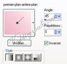*** 1- Ouvrir les tubes, les dupliquer et fermer les originaux. 2-Placer la sélection et vos formes dans vos dossiers respectifs. 3 - Prendre 2 jolies couleurs du tube fleur/couleur claire avant-plan/couleur foncée en arrière-plan. . 4- Dans l’avant-plan, faire un dégradé linéaire angle 45° répétition 0 case inverser cochée.