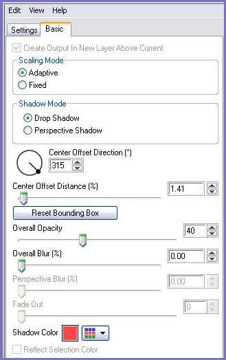 16 - Sur le même calque : Effets/Eye Candy 6 text-selection/Perspective Shadow/ Low Opacity, Red Onglet Basic avec ces valeurs :