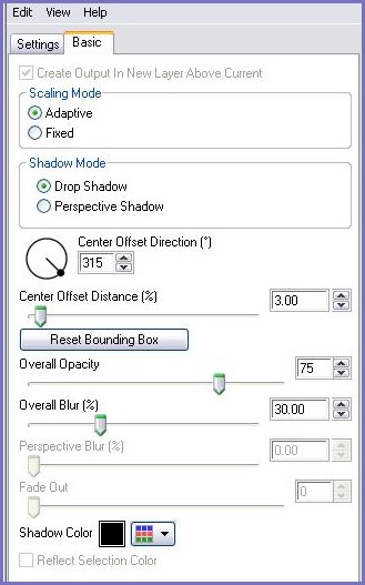 22 - Sur le même calque : Effets/Eye Candy 6 text-selection/Perspective Shadow/Drop/ Sharp Black Onglet Basic avec ces valeurs :