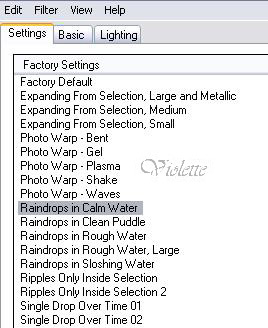 Calques/Supprimer/Calques/Fusionner le groupe 8 - Effets /Effets 3D/ Ombre Portée : 10/10/40/10/noir 9 - Effets/Eye Candy 5 Impact/Ripples/ Raindrops in Calm Water par défaut