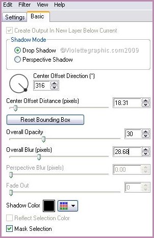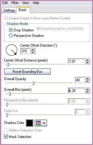 28 - Activer le travail précédent Edition/Copier/Edition/Coller comme nouveau calque** Eye Candy 5 Impact/Perspective Shadow/Drop Shadow, Lowest Onglet Basic:overall opacity 40 /overall blur 6.28 /couleur #000000