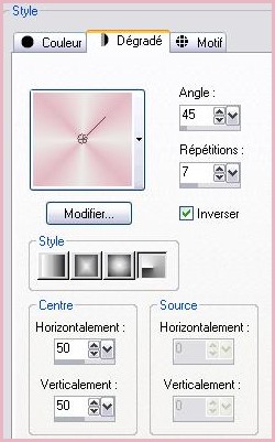 *** Ouvrir les tubes , les dupliquer et fermer les originaux Ouvrir la police et mettre en icône Exporter le pinceau stelle *** Partie 1 1 - Placer en avant-plan la couleur #ece9e7 et en arrière-plan la couleur #e3bac3 Configurer un dégradé radial/angle :45°/Répétitions: 7/ inverser coché