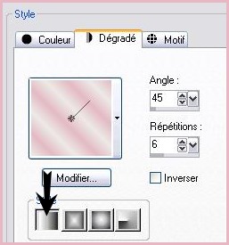 30 - Image/Ajouter des bordures : 30 pixels couleur #ffffff 31 - Sélectionner le cadre blanc avec la baguette magique Tolérance 0/ nuance 0 Établir le gradient style linéaire angle: 45°/Répétitions: 6