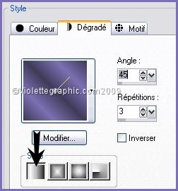 15 - Image/ Ajouter des bordures: 1 pixel couleur #24222e 16 - Image/ Ajouter des bordures: 30 pixels couleur blanche Activer la baguette magique/tolérance: 0/Progressivité: 0 Sélectionner le bord blanc 17 - Dans la Palette de Style Configurer le dégradé linéaire angle: 45/ répétitions : 3