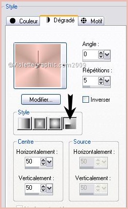 *** Ouvrir les tubes , les dupliquer et fermer les originaux Placer le motif_flowers dans le dossier "Motifs" de My PSP Files *** Partie 1 1 - Placer en avant-plan la couleur #fdcfc7 et en arrière-plan la couleur # c39f94Configurer un dégradé radial/Répétitions: 5/Inverser non coché