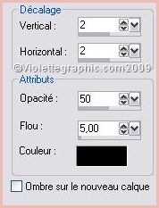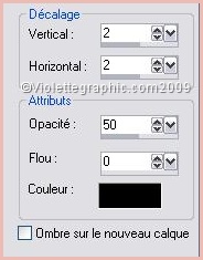 7 - Image/Redimensionner à 110%/décocher " tous les calques" 8 - Effets/Effets 3D/Ombre Portée : couleur #000000