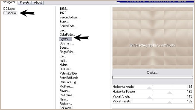 2 - Ouvrir une image transparente de 650 et 500 pixels remplir de dégradé 3 - Réglages/Flou/Flou gaussien : rayon : 104 - Effects/Filters Unlimited 2.0_DCspecial_Crystal: