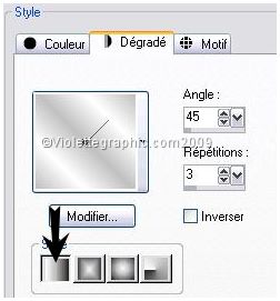 Partie 4 23 - Image/Ajouter des bordures : 30 pixels couleur #ffffffSélectionner le cadre blanc avec la baguette magique Tolérance 0/ nuance 0 Établir le gradient style linéaire angle: 45°/Répétitions: 3