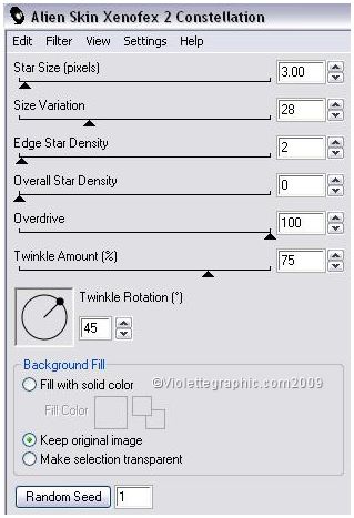 38 - Retourner dans votre PSP Annuler l'animation Effets/Alien Skin Xenofex 2/Constellation : clic sur "Random See" Edition/Copier