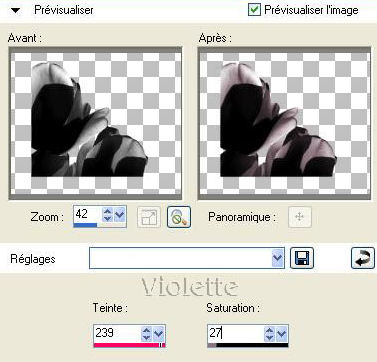 13 - Sélection/Sélectionner tout Sélection/Modifier/Contracter de 45 pixels Sélection/Inverser Appuyer sur la touche Supprim. Désélectionner 14 - Effets /Effets 3D/Ombre Portée : 3/3/100/10/noir Effets /Effets 3D/Ombre Portée : -3/-3/100/10/noir 15 - Ouvrir le calque fermé 16 - Activer le tube cmv_flowers / Image/Miroir Edition/Copier/Edition/coller comme nouveau calque Déplacer sur le côté droit Effets /Effets 3D/Ombre Portée : 2/2/42/10/blanche Effets/ Effets de Bords /Accentuer 17 - Activer le tube Mtm-flowers Réglages/Teinte et Saturation/Coloriser :