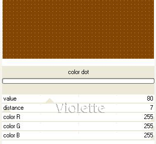 1 -Ouvrir les tubes, les dupliquer et fermer les originaux 2 –Ouvrir une image de 650 x 450 pixels /remplir de couleur #834703 3 - Effets/pentacom/color dot