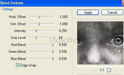 7 - Activer le tube iseeyo… Edition/Copier/Edition/coller comme nouveau calque Placer au centre Opacité à 30% 8 - Effets/FM Tile Tools /Blend Emboss par défaut