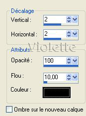 12 - Activer le tube stephane-couple Edition/Copier/Edition/coller dans la sélection 13 – Effets /FM Tile Tools/Blend Emboss par défaut 14 – Se placer sur le calque de la grille ( le calque 2 ) Effets /Effets 3D/Ombre Portée : 2/2/100/10/noire