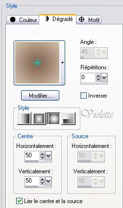 *** 1 -Ouvrir les tubes( ouvrir les calques ) , les dupliquer et fermer les originaux 2 - Placer en avant-plan la couleur #7f5d4b et en arrière-plan la couleur #d2c2acConfigurer un dégradé halo configurer ainsi :