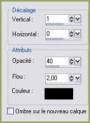 Calques/Nouveau calque ** Activer l'outil pinceau, localiser le pinceau Gerry-My Holiday Placer sur la gauche **Calques/Dupliquer **Image/Miroir **Calques/Fusionner le calque du dessous **Effets/Effets 3D/Ombre Portée :