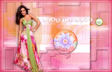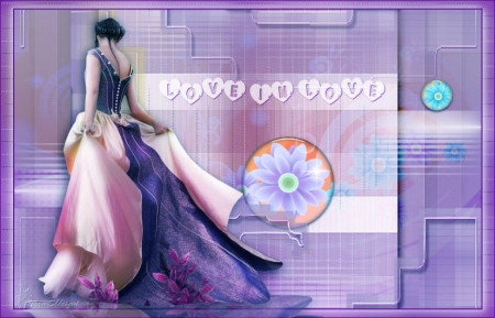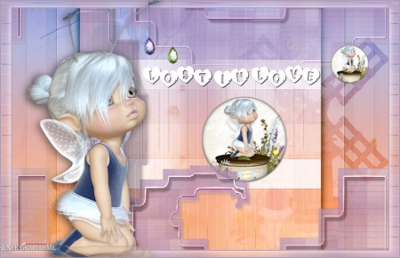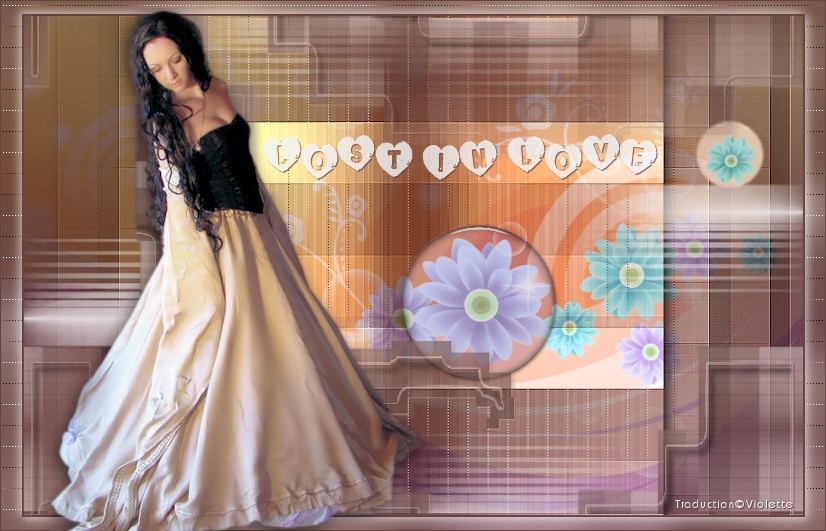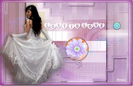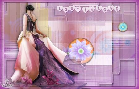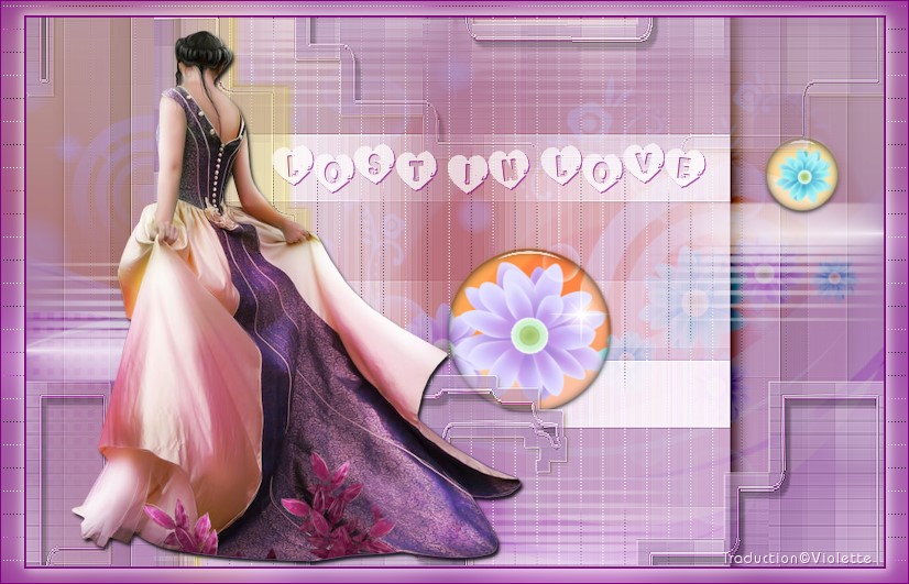 22 - Activer l'outil Texte/Police LOVERBOY/taille : 48/vectoriel avant-plan fermé /couleur arrière-plan #ffffff Entrer le texte : Lost in Love clic sur Appliquer Couches/Transformer le calque d 'arrière-plan **Effets/Effets 3D/Ombre Portée : 1/1/100/0 /couleur #800080 Opacité à 70%