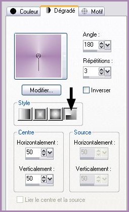 2 - Placer en avant-plan la couleur #ded0e0 et en arrière-plan la couleur # aa86b2 Dans la Palette de Style Configurer un dégradé radial angle: 180°/Répétitions: 3