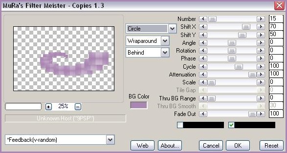 **Image/Redimensionner à 20%/décocher " tous les calques" **Effets/Mura's Meister/Copies réglages ci-dessous : couleur #aa86b2