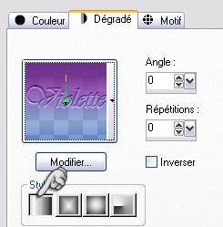 1 - Ouvrir les tubes , les dupliquer et fermer les originaux Placer le masque et la sélection dans les dossiers correspondants Importer le pinceau 2 - Ouvrir une image transparente de 500 et 425 pixels Remplir de dégradé "Blue-Purplelesgerrygradient" configuré ainsi: