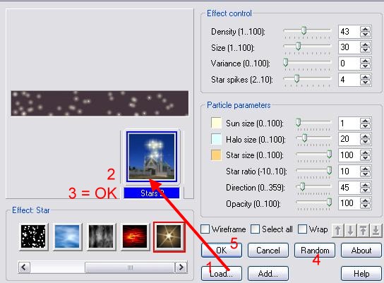 6 - Sélection/modifier/Contracter de 2 pixels Appuyer sur la touche "Suppr" Remplir de couleur #44343e Garder sélectionné Effets/Ulead/Particle: clic sur "Load" et sélectionner l'image: Stars 2/ OK