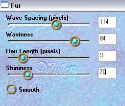 14 - Image/Ajouter des bordures : 1 pixel couleur #fffeee4 15 - Image/Ajouter des bordures : 15 pixels couleur noire Sélectionner avec la baguette magique Effets/Eye Candy3.1/Fur :