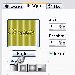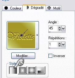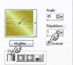 1 - Ouvrir les tubes , les dupliquer et fermer les originaux Placer la sélection dans le dossier correspondant Importer le pinceau 2 - Placer en avant-plan la couleur #d9ec9b et en arrière-plan la couleur #a59827 Configurer un dégradé linéaire linéaire/angle: 45°/ Répétition: 1/Inverser non coché