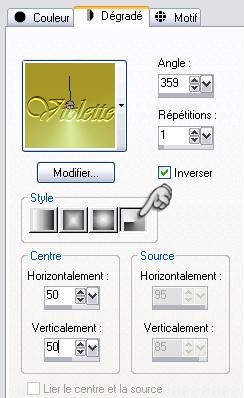 4 - Sélectionner la partie foncée du travail ( au milieu) Calques/Nouveau calque Remplir de dégradé linéaire/angle :45°/répétition: 1 / inverser coché