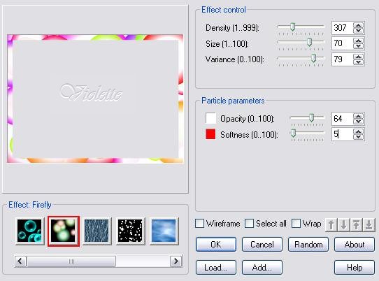 9 - Image/Ajouter des bordures : 20 pixels couleur blanche Effets/Ulead Particle: case 2/ seconde couleur rouge/réglages ci-dessous :
