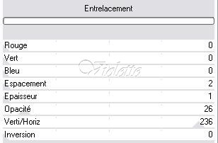 OK 10 - Réglages/Flou/Flou Gaussien: 15 11 - Effets/Jeux de lignes/Entrelacement: