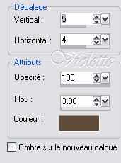 Calques/Fusionner le calque du dessous Effets/Effets 3D/Ombre Portée : 1/1/100/1/ couleur n°3 Répéter avec des valeurs négatives : -1 en décalage vertical et horizontal
