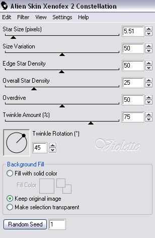 18 - Fermer les calques 1 et 3 Placez vous sur le calque 2 Effets/Alien Skin Xenoflex/Constellation : clic sur "Random Seed"