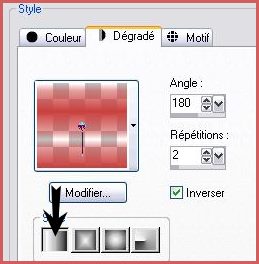 1 - Placer en avant-plan la couleur #ca403e ( ou toute autre couleur de votre choix )et en arrière-plan la couleur #000000 Configurer un dégradé linéaire angle: 180°/Répétitions: 2/Inverser coché