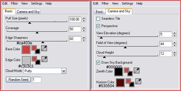7 - Effets/Alien Skin Xenofex 2/Little Fluffy Clouds Attention aux couleurs gauche : CA403E-C3C3C3 - droite : 000000-530504