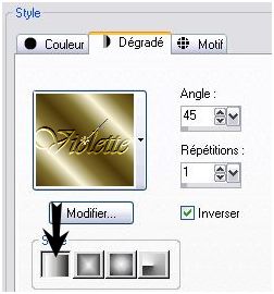 7 - Image/Ajouter des bordures : 1 pixel couleur blanche Sélectionner la bordure avec la baguette magique Remplir du dégradé "JB_gold7" avec ces paramètres