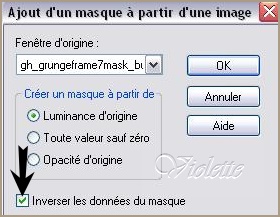 6 - Activer le masque "gh_grungeframe7mask_bunnysatticdotcom.jpg" Calques/Nouveau calque de masque/à partir d'une image/Ajout d'un masque à partir d'une image sélectionner le masque "gh_grungeframe7mask_bunnysatticdotcom.jpg" cocher luminance d'origine / cocher "inverser les données du masque"