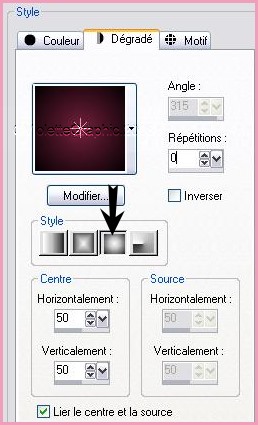 *** 1 - Ouvrir les tubes , les dupliquer et fermer les originaux 2 - Placer en avant-plan la couleur #73203c et en arrière-plan la couleur #030204 Configurer un dégradé halo/Répétition: 0
