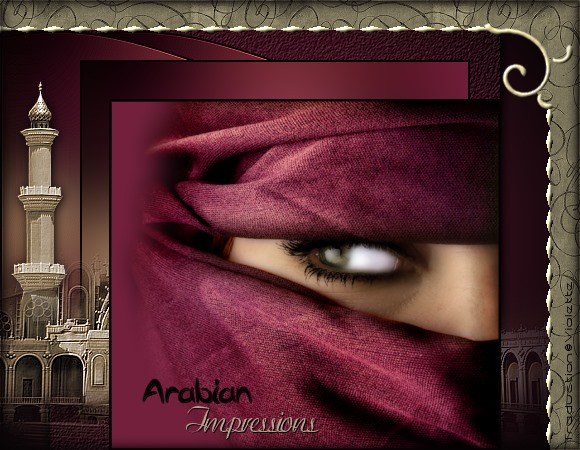 27 - Activer l'outil Texte/Police au choix couleurs choisies placées en arrière-plan couleur #73203c Entrer le texte : Arabianet couleur #b3a38e Entrer le texte : ImpressionsClic droit /Convertir en calque raster Placer comme sur le modèle