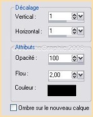 12 - Sélection/Sélectionner Tout 13 - Sélection/modifier/Contracter de 2 pixels 14 - Effets/Effets 3D/Ombre Portée : 1/1/100/2/noir