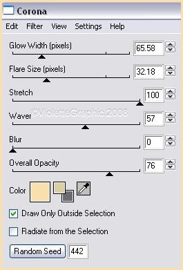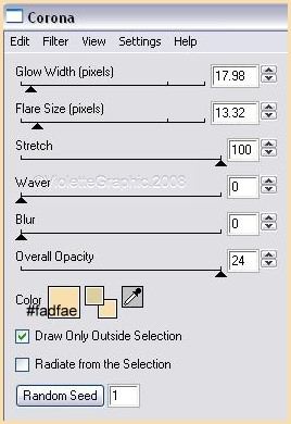 24 - Revenir en arrière 3 fois Activer le calque inférieur Sélection/Charger/Enregistrer une sélection/charger à partir du disque Charger la sélection amorph3 Effets/Eye Candy 4000/Corona même réglages Calques/Fusionner les calques visibles Edition/Copier/Edition/Coller comme nouvelle image sur votre seconde image Revenir sur votre première image