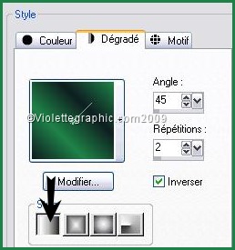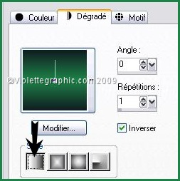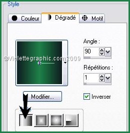 *** 1 - Ouvrir les tubes , les dupliquer et fermer les originaux 2 - Placer en avant-plan la couleur #1f8248 et en arrière-plan la couleur # 101e21Configurer un dégradé linéaire: angle: 0/Répétition: 1/inverser côché